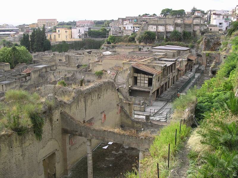 Das ausgegrabene Herculaneum liegt unter dem neuen Ercolano. Der Vesuv im Hintergrund. Die Ausgrabung ist ein ca. 1km x 1km großes Gebiet mitten in der Stadt. Die Küstenlinie hat sich nach dem Vulkanausbruch ca. 100 m verschoben. - Wer übriges glaubt, die Römer hatten nur Skulpturen von klassischen Schönheiten gemacht - hier mal was anderes.