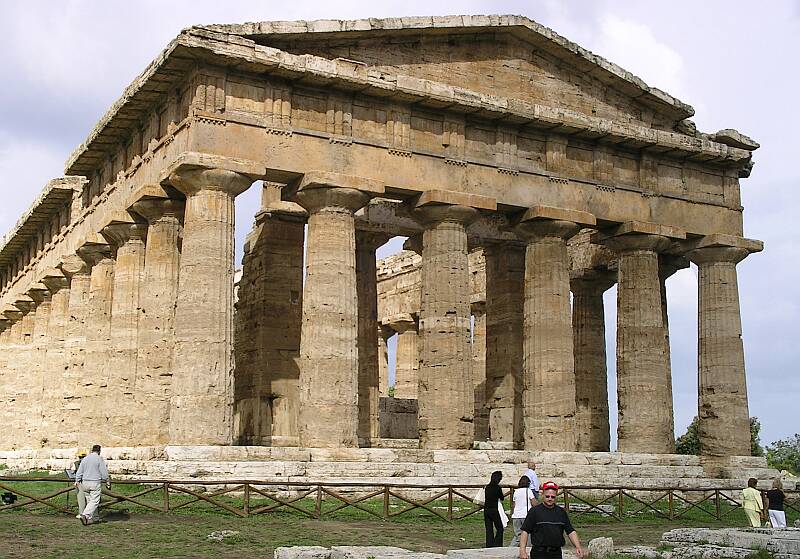 Die besterhaltenen griechischen Tempel stehen 100 km südlich von Neapel. Eine ehemalige griechische Kolonie in Italien, wurde später von den Römern erobert. Die Lagune vor der Stadt, ein natürlicher Hafen, versumpfte nachdem immer mehr Wälder gerodet wurden und die Flüsse die erodierte Erde an der Küste anschwemmten. Eine Süßwasserlagune ist Brutgebiet der Malariamücke. Wegen der Malaria wurde die Stadt aufgegeben. Sie wurde vom Sumpf überwuchert, vergessen und erst um 1750 wieder entdeckt. Ein großes Ruinenfeld. Ein Großteil der Stadt wurde im Zuge der Entwässerung der Sümpfe schon ausgegraben, ein Teil wurde wieder mal überbaut. Wie man über einem Ruinenfeld jemals eine Baugenehmigung erhalten haben kann, wird mir immer unverständlich bleiben.
