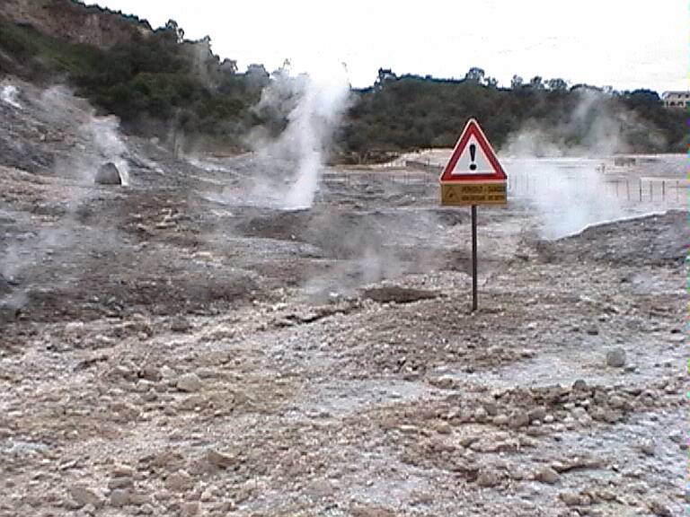 Nach so viel heißer Kunst ging es vor die Stadtgrenze nach Pozzuoli. Heiß bis zum heutigen Tag sind hier die Vulkandämpfe der Sovatara. Im Krater ist übrigens ein Campingplatz, vermutlich der heißeste (geologisch betrachtet) der Welt. Man erreicht den Krater durch den Torbogens eines Hauses in dem die Verwaltung des Campingplatzes ist und ein kleines Museum. Eintritt 5 Euro! Der Vulkan ist eine GmbH (Volcano Solvatara SA), jedenfalls laut Titel der Eintrittskarte. Es stink manchmal etwas nach Schwefelwasserstoff von den Dampfquellen nebenan. In einem Tümpel köchelt der Schlamm.