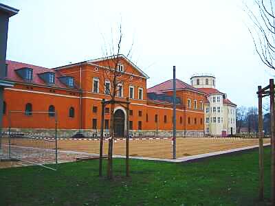 Auf dem Weg vom Achteckhaus zum eigentlichen Schloß sehen wir als erstes den Barock-Teil (Westflügel), in dem sich vermutlich im Frühjahr 2004 der Eingang befinden wird. Auch das Schloßrestaurant ist da.