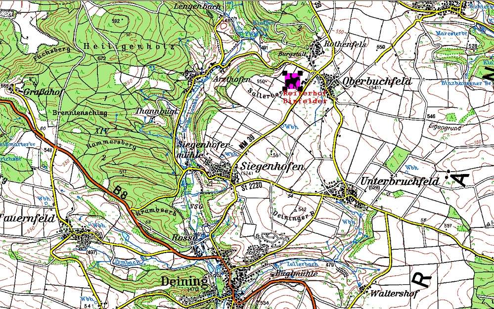 Der Hof ist an der Straße zwischen Oberbuchfeld/Rothenfels und Siegenhofen am Ortsrand von Oberbuchfeld. Die Karte zeigt ungefähr die Landschaft, wie sie auch dem Bild mit dem Motorrad abgebildet ist. Vom Hof weg sind schöne Ausritte zu machen.